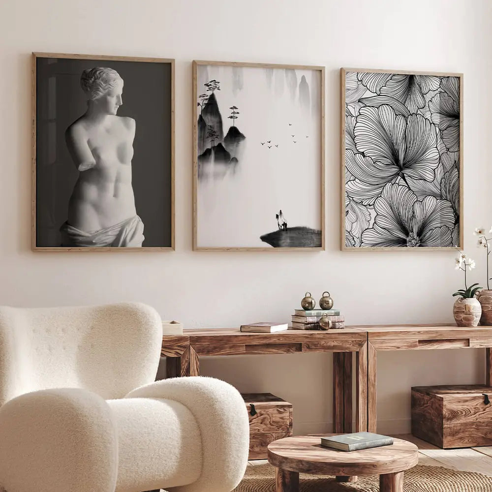 - Frame Color: Natural wood, black, and white, showcasing the distinct wood grain.