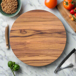 Elevate your culinary experience with our exquisite, personalized cutting board, crafted from premium round teak wood! This isn't just any kitchen accessory – it's a statement piece that combines functionality with style. Imagine slicing, dicing, and chopping on a surface that's as unique as your cooking style. Made from solid, high-grade teak, this cutting board is not only a durable workhorse but also a stunning serving tray for your next charcuterie spread.