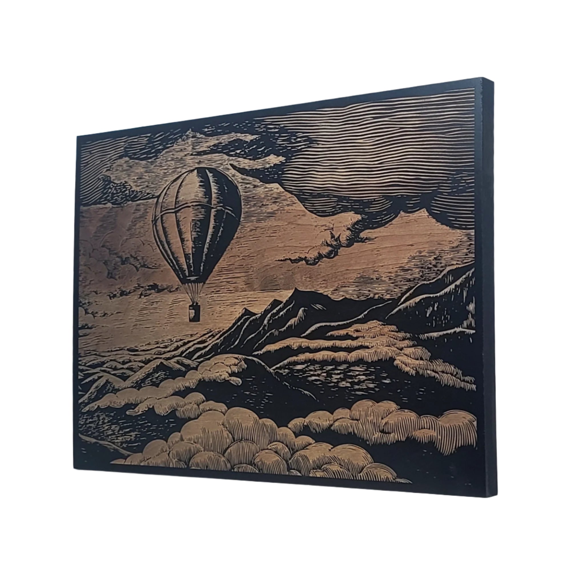 Add a whimsical touch to your space with this Vintage Hot Air Balloon over Mountains engraved wooden sign. Crafted from smooth Aspen hardwood and laser engraved for crisp detail, it comes ready to hang with a sawtooth hanger. Available in three sizes, this black sign brings a playful, nostalgic vibe to any indoor room. Perfect for dreamers and adventurers alike!
